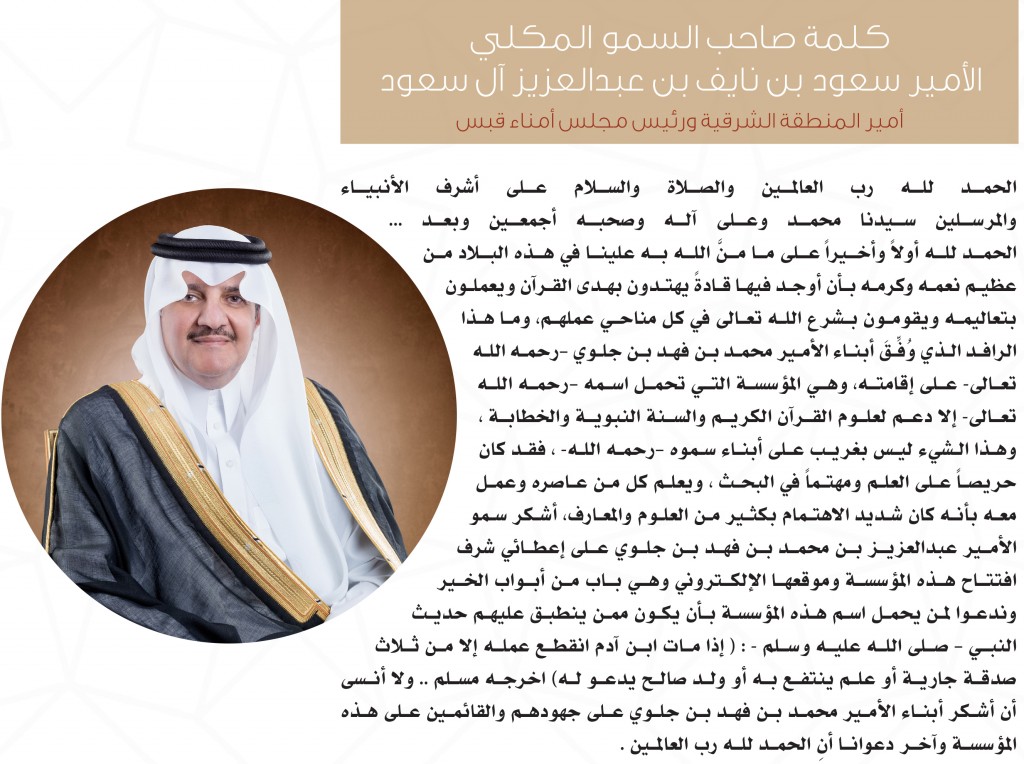 سمو الأمير عبدالعزيز بن محمد بن فهد يفتتح الفرع الأول لجمعية قبس للقرآن والسنة والخطابة في الشرقية