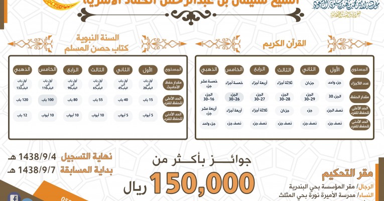 قبس تبدأ مسابقة الحماد الثالثة أطلقت مؤسسة قبس للقرآن و السنة و الخطابة (مسابقة الشيخ سليمان بن عبدالرحمن الحماد الأسرية الثالثة) يوم الجمعة الموافق 1438/9/7هـ بحمد الله . و شهدت المسابقة في بدايتها تفاعلًا وتنافسًا بين الأسر المتسابقة والمشاركة في فعاليات المسابقة، كما شهدت حرص أولياء الأمور على تحفيز أبناءهم وتشجيعهم على مراجعة الحفظ . […]