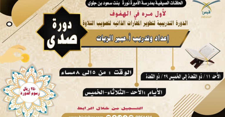 تعلن مدرسة الأميرة نورة ولأول مرة في الهفوف عن إقامة دورة صدى إعداد وتدريب أ.عبير الزيات تاريخ البدء : الأحد 11/ذو القعدة إلى الخميس ٢٩/ذو القعدة الأيام :الأحد -الثلاثاء-الخميس الوقت : من ٥الى ٨مساء رسوم الدورة /٢٥٠ ريال لمعرفة موقع المدرسة اضغط هنا للتفاصيل والاشتراك اضغط هنا