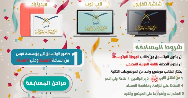 تعلن مؤسسة قبس للقرآن والسنة والخطابة عند بدء مرحلة التسجيل لمسابقة ملسان قبس وذلك لطلاب المرحلة المتوسطة. على أن تكون الخطبة باللغة العربية الفصحى، وأن يلقيها المشارك حفظاً وعن ظهر قلب دون النظر إلى الورقة. وسوف يتم طرح المشاركات المتأهلة لتصويت الجمهور علماً بأن ٣٠٪ من التقييم لتصويت الجمهور و ٧٠٪ للجنة التحكيم. وعن هذه […]